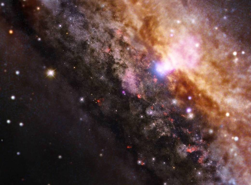 Esta galaxía se encuentra a 13,000,000 de años luz de nuestro planeta en el que se encuentra un agujero negro en la parte superior de color blanco brillante.