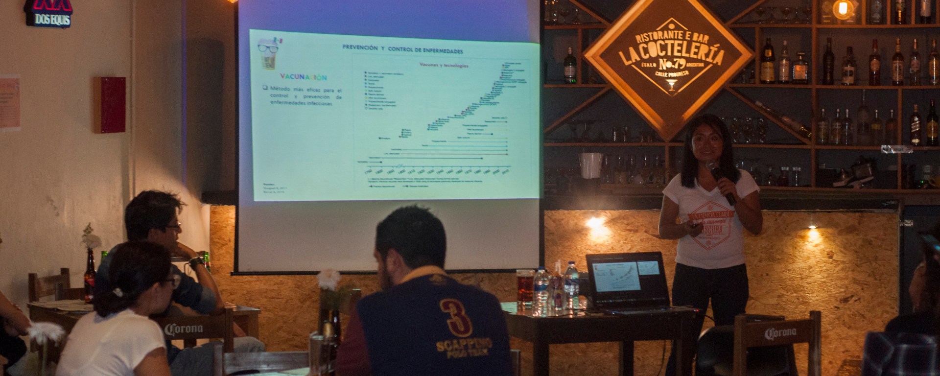 Primera noche de Pint of Science México, segunda exposición en La Coctelería, Guadalajara (Jalisco): las maestras en ciencias Mirna Burciaga Flores y Lorena Zapata Cuéllar, adscritas a la unidad Biotecnología Médica y Farmacéutica del Centro de Investigación y Asistencia en Tecnología y Diseño del Estado de Jalisco (Ciatej) como estudiantes de doctorado, nos hablaron sobre las proteínas recombinantes, organismos genéticamente modificados (OGM) cuyos múltiples y potenciales usos nos dan una idea de por qué las investigadoras equiparan la importancia de los métodos de edición genética con la propia del descubrimiento del fuego.