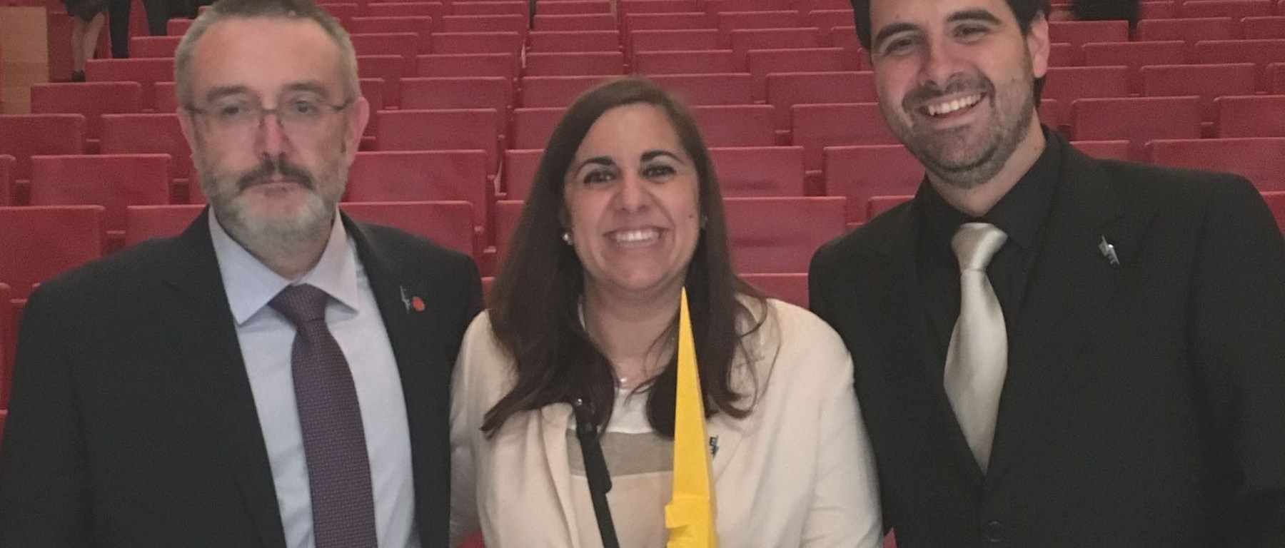 Los investigadores Luis Gandía (izda), Cristina Salazar y Fernando Bimbela (dcha), con el trofeo logrado en el concurso SciencEkaitza. Fuente: http://www.sciencekaitza.com