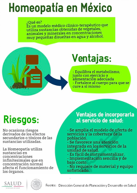 En la República Mexicana, la homeopatía es reconocida desde mayo de 1997 en la Ley General de Salud donde se habla en el Artículo 224 sobre la existencia de medicamentos alopáticos, homeopáticos y herbolarios, siendo plasmado en el Reglamento de Insumos para la Salud en el que se regula la definición, registro, elaboración, envasado, publicidad y establecimientos de los mismos.