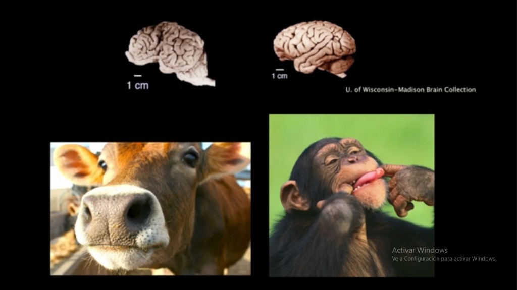 Los chimpancés, en este caso, tienen la capacidad de manifestar comportamientos más complejos, elaborados y flexibles que las vacas. Entonces el postulado de que «todos los cerebros se forman de la misma manera» no es del todo correcto.
