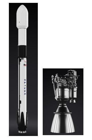 La lanzadera utiliza como sistema de propulsión principal un tipo de motor de una familia conocida como motores Merlín, desarrollados también por SpaceX. El motor Merlín utiliza como combustible un propelente de oxígeno líquido y queroseno, diseñado para su recuperación y reutilización. El motor cuenta con una capacidad de empuje de hasta 845 kN. Se observa en la ilustración el diseño del cohete y el motor.