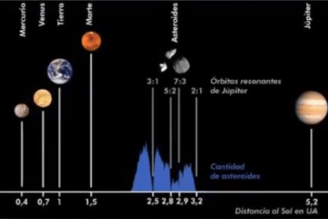 Observemos por un momento el histograma de la figura 1 (las zonas en azul), estos son la cantidad de asteroides en función de su distancia. Podemos observar que hay algunos huecos, actualmente conocidos como “huecos de Kirkwood”, donde parece que faltan asteroides. Estos huecos corresponden a lo que los astrónomos llaman “resonancias orbitales con júpiter”, ¿a qué se refiere esto? por ejemplo: la resonancia 3:1 significa que, mientras júpiter da una vuelta alrededor del sol, el asteroide que se encuentre en esa zona dará 3 vueltas alrededor del sol.