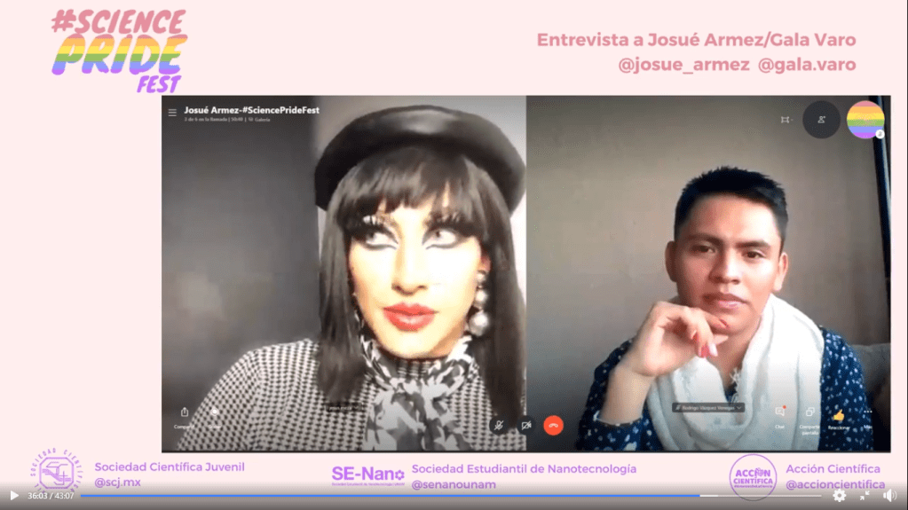 Una de las charlas más populares dentro de este Science Pride Fest, fue la entrevista a Josué Armez / Gala Varo, Dr. en Ciencias Biomédicas, profesor investigador en la Universidad de Guadalajara, modelo, acróbata, bailarín, drag queen y actual ganadora de «Toma Mi Dinerita». Un claro ejemplo de cómo día con día las barreras de los estereotipos se van derribando en el mundo científico y social.