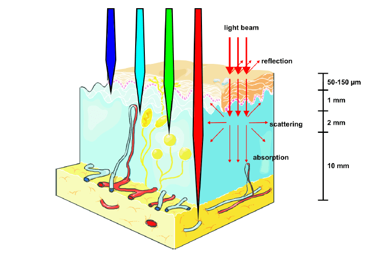 Ahora, la luz y la materia pueden tener 4 tipos de interacción: refracción, reflexión, absorción y dispersión. Los fotones reflejados nos permiten ver la capa más superficial de la piel, la luz esparcida eventualmente escapa en forma de luz reflejada difusa, los fotones absorbidos, su energía se transfiere al tejido y puede excitar electrones de sus moléculas y se puede obtener disipación de calor, fluorescencia, fosforescencia, formación de radicales libres o inducción de reacciones fotoquímicas. También, la luz con gran cantidad de energía, como la radiación UV o los rayos X, pueden ionizar a las moléculas e inducir reacciones fotoquímicas con efectos secundarios no deseados en el cuerpo, como alteraciones en nuestro ADN.