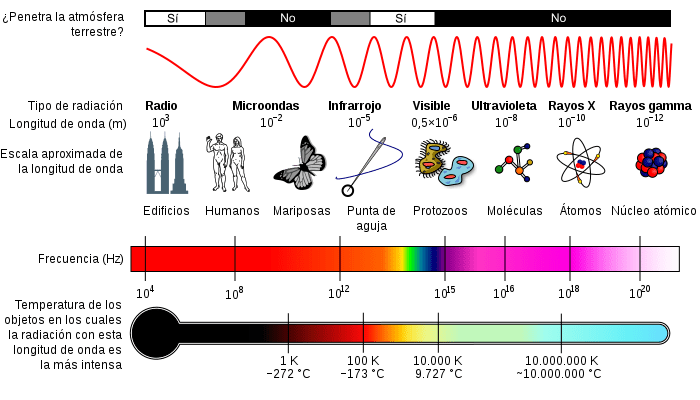 2. Luz. Primero comencemos describiendo lo que es la luz y sus propiedades energéticas. La luz es un tipo de radiación y se propaga en ondas electromagnéticas, las cuales transportan energía. Existe una relación inversamente proporcional entre la energía que pueden transportar y la longuitud de onda, de modo que cuanto mayor es la longuitud de la onda, menor es su energía. Por ejemplo, los rayos ultravioleta y los rayos X son muy energéticos porque su longuitud de onda es muy corta, en cambio la radiación infrarojo es muy poco energética debido a su longuitud de onda tan grande. Las ondas electromagnéticas se clasifican según su frecuencia como puede verse en el siguiente diagrama: