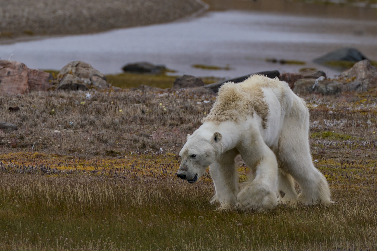 El oso polar, de la especie Ursus maritimus, es el carnívoro terrestre más grande del planeta. Se alimenta principalmente de focas cuando salen a respirar en hoyos que ellas mismas hacen a través de la capa congelada del Mar Ártico. La forma en la que estos super depredadores cazan consta mayormente en esperar junto a los hoyos de respiración hasta que salga una foca y la puedan atrapar, pero para esto debe estar congelada la superficie del mar. Al aumentar la temperatura del planeta, la formación de la capa de hielo sobre el Mar Ártico disminuye, permitiéndole a las focas no depender de los hoyos de respiración y consecuentemente, obliga a los osos a caminar grandes distancias en busca de alimento e inclusive en ocasiones tienen que nadar. Ahora bien, el gasto energético que permite a un oso polar estar en este clima tan extremo es grandísimo. Se estima que un oso polar adulto consume 12,000 calorías al día tan solo para mentenerse vivo. Sumándole a este consumo diario, ahora tienen que moverse grandes distancias para encontrar su alimento lo que conlleva a un mayor gasto energético. Y como si no fuera poco, cuando nadan gastan aún más energía para mantener su temperatura corporal, porque un cuerpo mojado pierde calor más rápido que un cuerpo seco. En diciembre del 2017, una video publicado por la ONG Sea Legacy nos mostró una dura realidad en la que los osos polares pueden vivir. En este video se muestra un individuo que presentaba altos niveles de desnutrición buscando comida entre una pila de basura y chatarra. Aunque el video ha sido criticado por dramatizar o exagerar la situación en la que viven los osos polares, nos dio un vistazo de lo que podría suceder si las temperaturas siguen aumentando; un mundo natural hambriento que vaga desesperádamente en busca de comida en un lugar donde nunca encontrará.