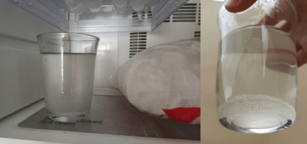 Análogamente, si colocamos un poco de la solución saturada (a temperatura ambiente) en un vaso y lo metemos al congelador hasta que su temperatura baje lo suficiente observamos que se deposita sal en el fondo. Podemos concluir que la temperatura es un factor que interviene en la solubilidad de la sal en el agua.