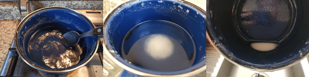 Ahora, retiramos esa sal que no pudo disolverse para quedarnos solamente con la solución saturada, podría ser cambiando de recipiente directamente a una pequeña olla, donde procedemos a calentar la solución. Ponemos la olla a fuego bajo y agregamos una pequeña cucharadita de sal y agitamos. A medida que aumente la temperatura observamos que ahora la sal si logra disolverse. Apagamos la llama y cuando la solución alcanza la temperatura ambiente observamos que se deposita sal al fondo del recipiente.