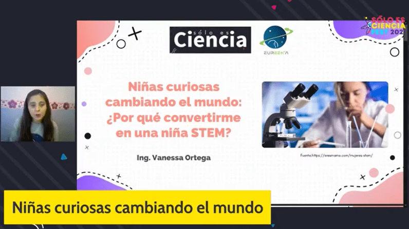 La conferencia Niñas curiosas cambiando el mundo: ¿Por qué convertirme en una niña STEM? fue impartida por Vanessa Ortega. Durante la ponencia se habló de la brecha de género, los prejuicios y estereotipos que aún existen en las áreas STEM. Mediante su presentación fue motivando a las niñas y mujeres a cambiar el mundo.
