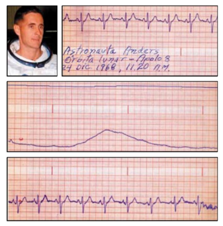 «Los signos clínicos normales en órbita difieren de los que se registran en la Tierra…» comentó. Al momento de interpretar el cardiograma percibió que mostraba características normales, pero con ciertas diferencias, ya que la ausencia de la gravedad produce muchos cambios a los astronautas. Observó que la frecuencia cardiaca de Anders disminuyó un poco, en lugar de 70 latidos por minuto, su corazón registró 60. «Por la falta de gravedad baja la frecuencia de la presión con la que circula la sangre y el corazón bombea más lento», concluyó. Detectó que la forma del trazo indicaba un estado de vagatonía, para evitar tecnicismos quiere decir un estado contrario al efecto de la adrenalina.