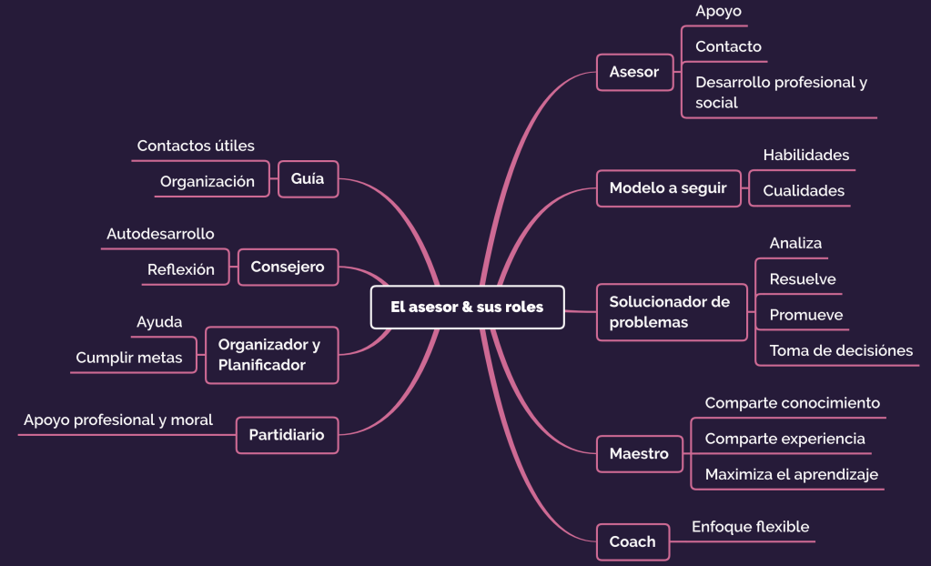 - Asesor. Ofrece apoyo y asesoramiento a los estudiantes sobre su carrera, desarrollando contactos sociales y construyendo redes.