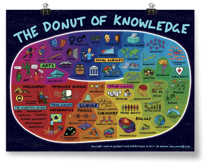 Si eres un miembro nuevo en el mundo de la ciencia, ¡te doy la bienvenida! Probablemente te puede parecer que estás entrando a un océano con muchos conocimientos por aprender. En la siguiente imagen se presentan todas las áreas que utilizan esfuerzo humano y se muestra cómo se relacionan entre sí desde la filosofía, las ciencias exactas y aplicadas, las ciencias sociales y las artes. El físico y mentor Dominic Walliman ha dibujado una representación de estas áreas como una gran dona de conocimiento en su cuenta DomainOfScience