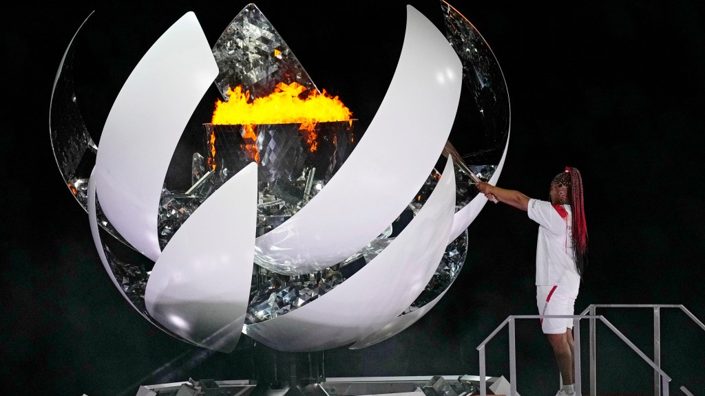 Naomi Osaka lights the Olympic flame during the opening ceremony in the Olympic Stadium at the 2020 Summer Olympics, Friday, July 23, 2021, in Tokyo, Japan. (AP Photo/David J. Phillip)