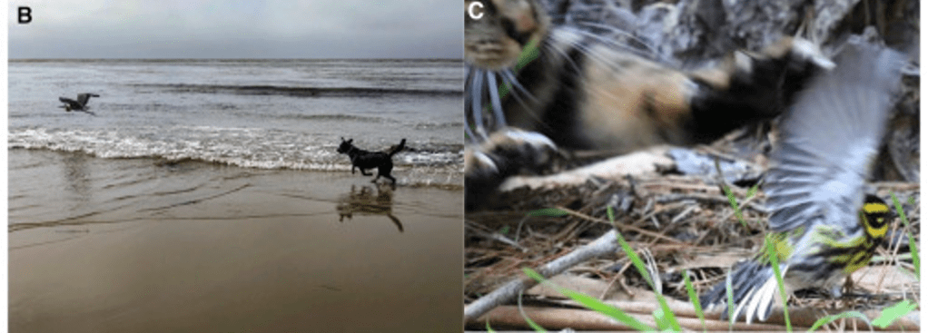 Varios estudios han demostrado que solo la presencia de algún tipo de depredador (perro, gato, etc), puede estresar a especies locales. Por ejemplo, el pasear perros en una área boscosa (donde esta prohibido pasearlos) condujo a una reducción del 35% de la diversidad de aves y en un 41% la abundancia de las mismas.