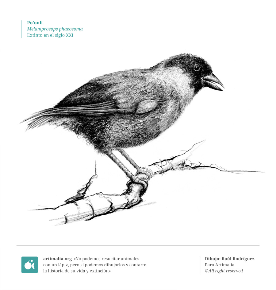 *El pájaro po’ouli era originario del archipiélago hawaiano, donde se descubrió en la segunda mitad del siglo XX (1973). Se cree que procede de un linaje antiquísimo de pájaros mieleros (honeycreepers), una especie oriunda de las islas de la que no se habían encontrado descendientes desde 1923. De los tres ejemplares restantes en 2004, un macho fue capturado con el fin de intentar preservar la especie mediante un plan de reproducción de emergencia. Sin embargo, falleció el 26 de noviembre antes de que se pudiese encontrar una hembra. Los dos pájaros restantes no se han avistado desde entonces. La incursión de cerdos y mangostas en su hábitat y la propagación de algunas enfermedades por parte de los mosquitos son las principales causas de su extinción.