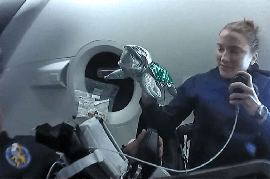 Cuando el cohete despega, el peluche permanece sujeto en la cabina. Una vez que la nave alcanza la órbita terrestre y la gravedad disminuye significativamente, el peluche comienza a flotar, señalando que los astronautas han entrado en un entorno de ingravidez.