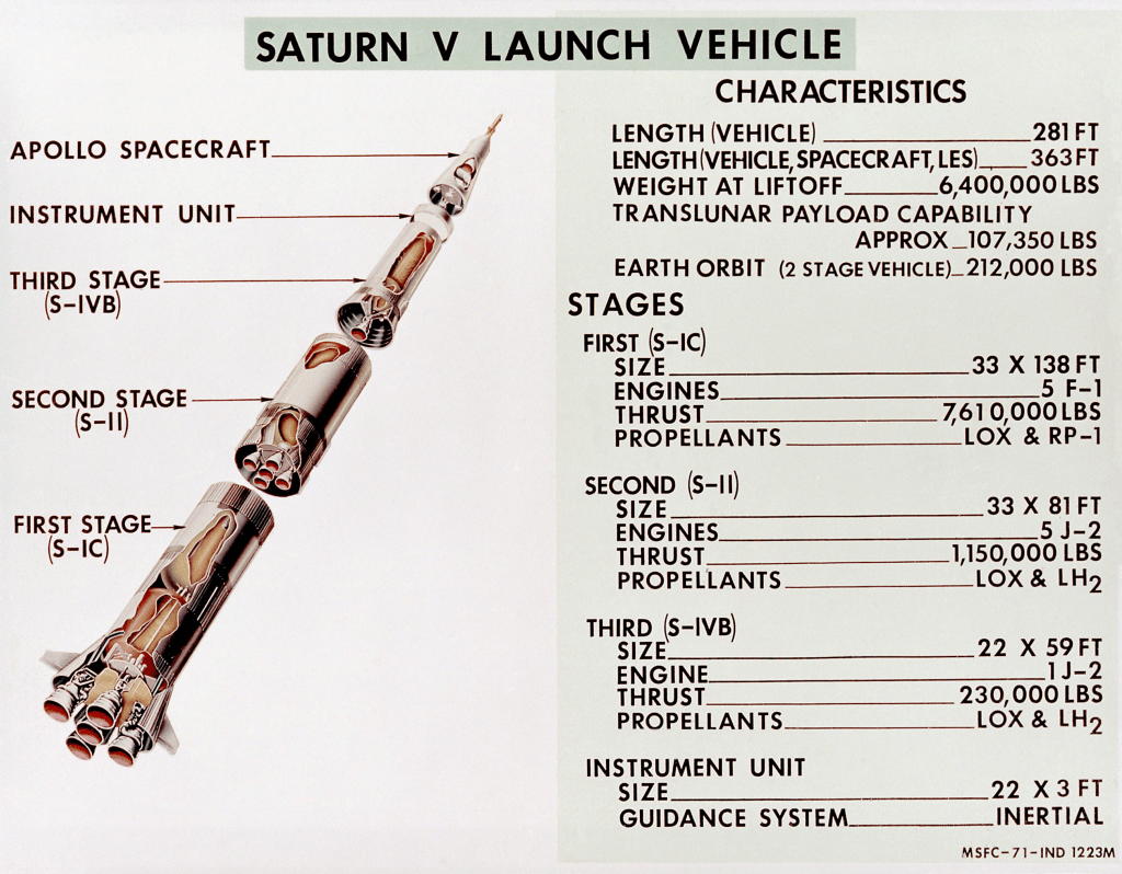 El Saturno V fue el cohete utilizado para las misiones Apolo tripuladas, y hoy en día continúa siendo uno de los vehículos de lanzamiento más potentes jamás construido. Consistía de 3 etapas: La primera, S-IC, es la que hacía despegar todo el cohete de la plataforma. La segunda etapa, S-II le daba a la carga útil un empujón en medio de la órbita. Ambas etapas cayeron al océano una vez que cumplieron su función de impulsar al módulo lunar en la punta fuera del planeta. La tercera etapa, la S-IVB, fue la que puso la nave en su última órbita de aterrizaje alrededor de la Luna.